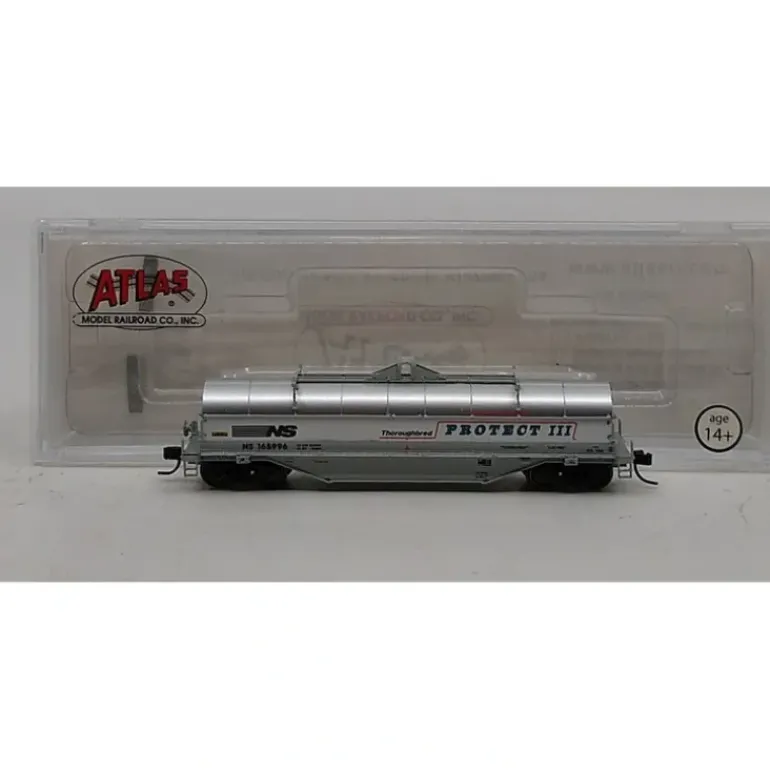 This is Atlas 50 000 857 N 42′ Coil Steel Car NS #165996/gray/black/blue/red. The increased volume of coiled steel transportation gave rise to a new purpose-built freight car. Previously rolls of coiled-steel had generally traveled in specially equipped gondola cars. In the 1960s a lighter type of car emerged specifically for hauling coils of steel in an integral trough. The car type gained popularity and eventually over 17,000 cars were built. Atlas model replicates a 42 design with a distinctive fishbelly side sill.