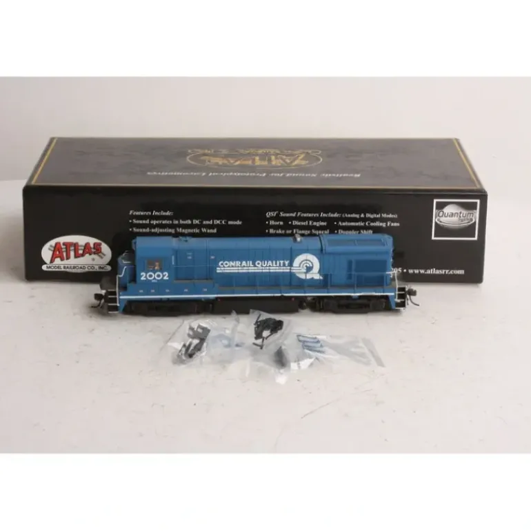 FB-2, AAR type B, or Blomberg truck side-frames used where appropriate per road name Additional Features: Separately-applied scale detail parts include: windshield wipers, metal grab irons, coupler cut levers, multiple-unit hoses, snow plow, train line hoses, fine scale handrails, and more! See through step detail on sill Etched metal radiator grilles Painted crew members Factory-equipped with AccuMate knuckle couplers Coupler pocket designed to accept AccuMate Proto-couplers Five-pole skewed armature motor with dual flywheels for optimum performance at all speeds Directional lighting Atlas Master Series Silver Additional Features: NMRA 8-pin plug for DCC (Decoder-ready) Atlas Master Series Gold Additional Features: