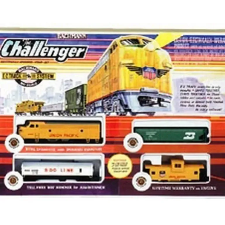 This is The Challenger HO Scale Electric Train Set by Bachmann Trains. Includes: EMD F9 Union Pacific locomotive and 3 freight cars. E-Z Track snap-fit track (with steel rail) and black roadbed system: makes a 36 circle; eleven 18 radius curved, one 18 radius curved terminal rerailer, and power supply.