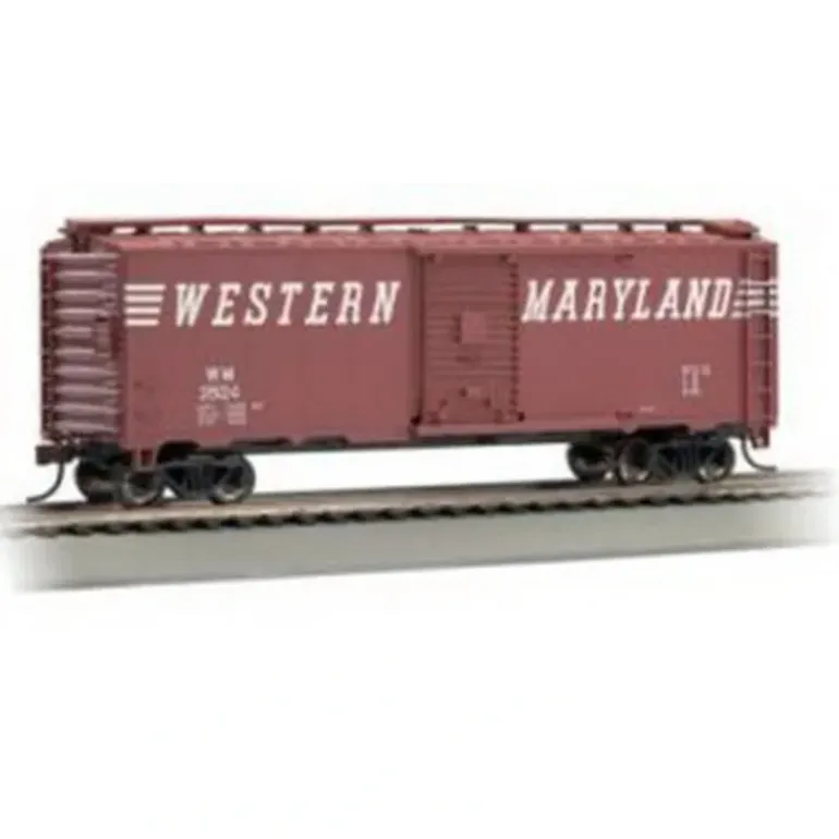 This is Bachmann 17041 HO Western Maryland 40′ Boxcar. Features include blackened metal wheels, non-magnetic axles, and body mounted couplers.