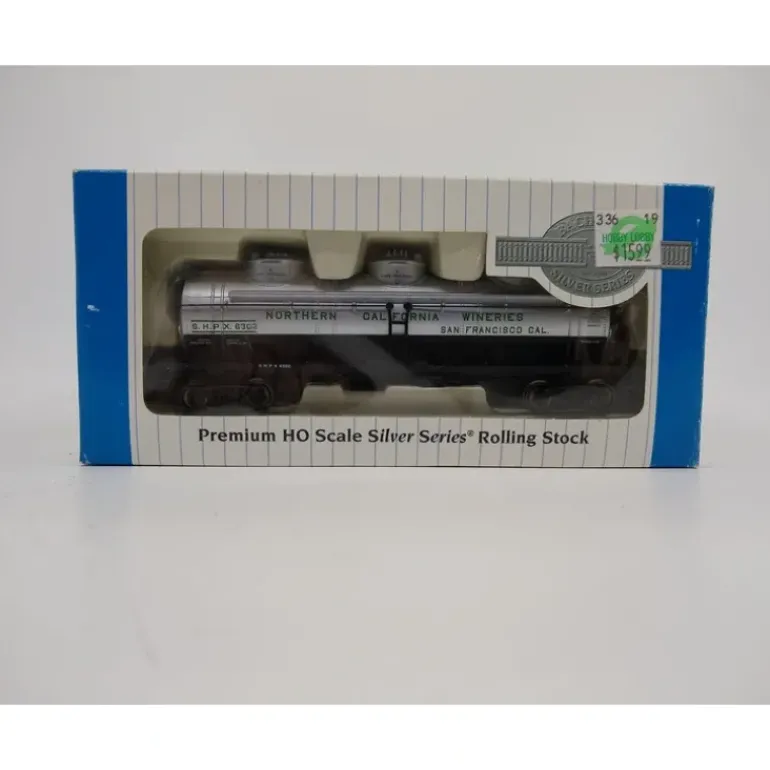 This is a Bachmann 17141 HO Scale Northern California Wineries 40′ 3-Dome Tank Car. Features include blackened metal wheels, body mounted couplers, and non-magnetic axles.