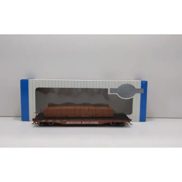 This is Bachmann 18927 HO Western Maryland 50′ Flatcar w/Crated Load Its key features are: Blackened metal wheels Body mounted couplers Non-magnetic axles.