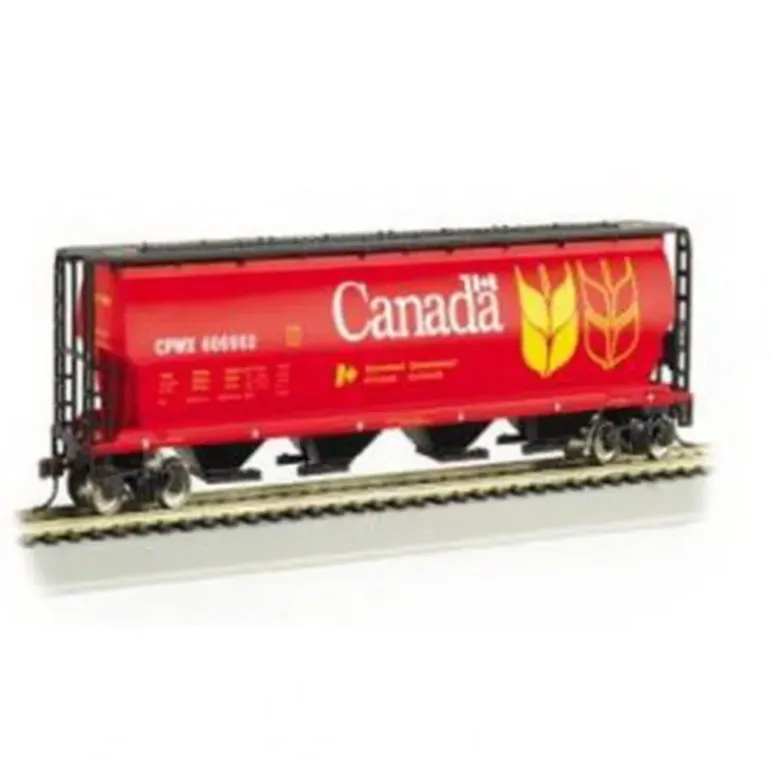 This is a Bachmann 19131 HO Canada Grain 4-Bay Cylindrical Grain Hopper #606902. From Silver Series featuring blackened metal wheels, body mounted couplers and non magnetic axles. Painted in red, black and yellow.