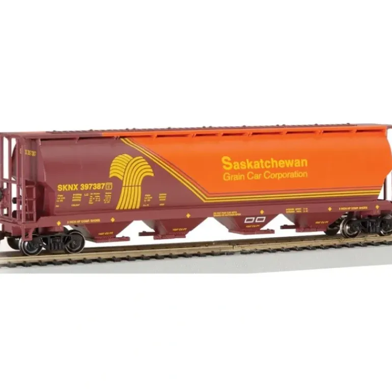 This is Bachmann 19140 HO Scale Saskatchewan Grain Car Corp. Cylindrical 4-Bay Grain Hopper #397387. From Silver Series featuring blackened metal wheels, body mounted couplers and non magnetic axles. Painted in orange and brown with yellow lettering. Road number 397387.