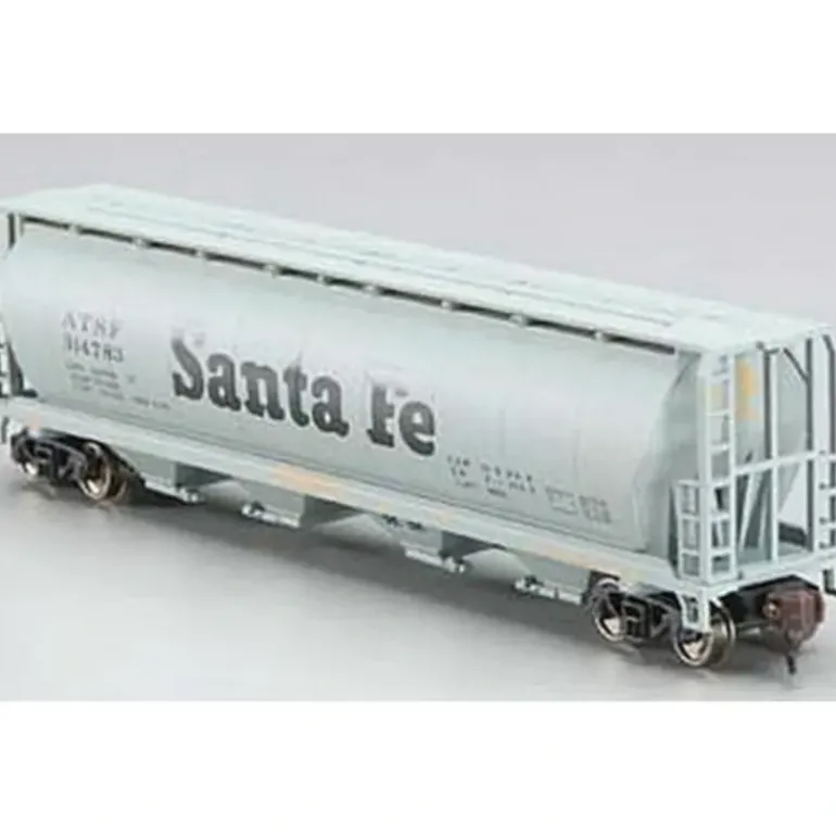 This is Bachmann 19152 N Santa Fe Cylindrical 4-Bay Grain Hopper. Features includes NMRA profile wheels, needle-point axles, body-mounted E-Z Mate Mark II couplers. Painted in gray and black Billboard Lettering. Road number is 314783.