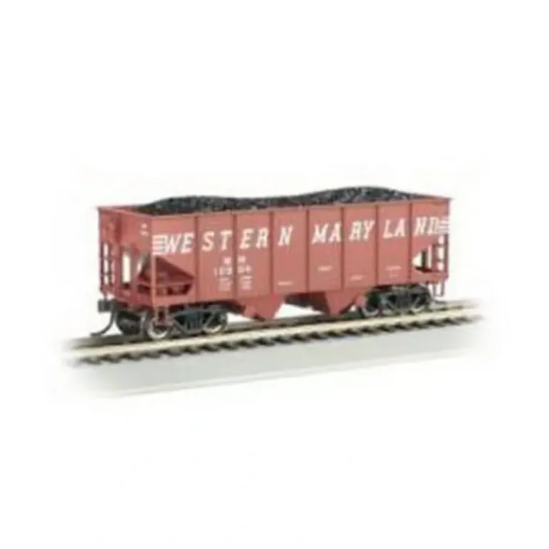 This is Bachmann 19504 HO Western Maryland 55-Ton Outside-Braced Hopper w/Load #10904 . Features includes body mounted couplers. Non-magnetic, blackened-brass axles with needlepoint bearings. Removable coal load.