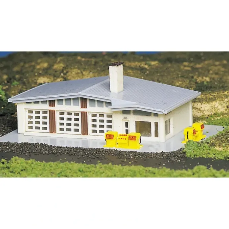 This is Bachmann 45904 N Plasticville Assembled Shell Gas Station. Features includes super detailed, hand decorated, fully assembled gas station. Ready-to-use on any N scale model. Gas station resembles most stations: the outside has white brick siding with a gray roof, station has three double garage doors, gas pumps located in front of the station and to the side, station comes blank with no decals and ready for your customization.