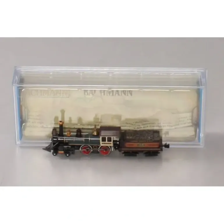 This is Bachmann 51151 N Union Pacific 4-4-0 American Steam Locomotive & Tender #119. Features includes narrow 4-4-0 locomotive is blue/green with a black front and chimney, flat square maroon cabin roof and beige cabin sides. Cabin of locomotive contains two windows on each side, above the #119. Metal drive wheels with traction tires and crank supports, compatible with all N scale equipment. Coal tender has a maroon body with gold and red designs and the #119; Union Pacific A A painted on the sides in gold. Tender complete with a built-in motor, wheels and springs. Instruction sheet with tips, a trouble-shooting guide and pictorial reference guide. Lifetime limited warranty on all Bachmann locomotives.