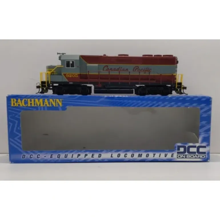 This is Bachmann 60705 HO Canadian Pacific EMD GP35 Diesel Locomotive w/DCC #8205. Features includes fully assembled and ready to run on conventional DC-powered layouts, DCC on board technology, enabling you to control the direction, speed, and lighting using the Bachmann E-Z Command Digital Command Control System or any NMRA-Compliant DCC system, equipped with a 28-speed step decoder that is factory-preprogrammed to address button 3 on NMRA-compliant DCC systems. 100% backwards-compatible with standard DC (non-digital) layouts, main track programming, all wheel drive, directional lighting, die cast chassis. 5-Pole Skew Wound Motor, E-Z Mate Mark II couplers with metal coil springs, accurately molded plastic body shell, compatible with all NMRA-compliant DCC systems, painted in color maroon, gray.