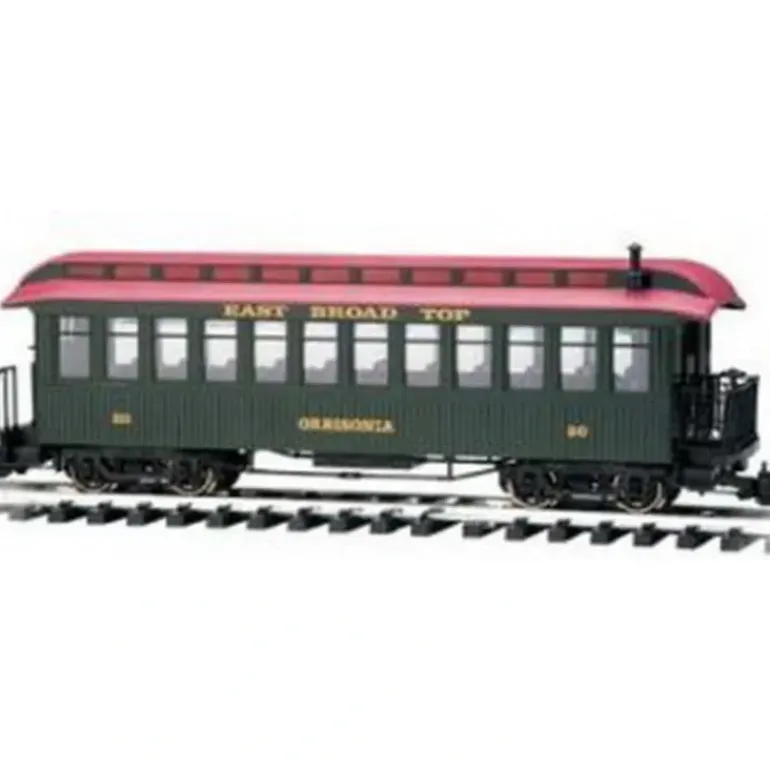 Here is a Bachmann 89694 East Broad Top Observation Car. These classic passenger cars feature track-powered interior lighting (except Baggage Cars as per prototype), metal handrails, and metal wheels. This car features plastic operating knuckle couplers.