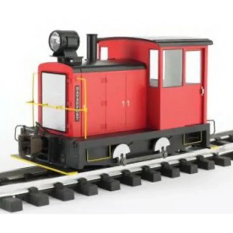 Features for this unit include: DCC ready with NMRA 8-pin socket, heavy-duty can motor, die-cast chassis (powered on both axles), die-cast metal side rods and counterweights, LED headlight (constant lighting), removable hood for access to three-position polarity switch for conformance to NMRA standards or large scale model railroading practices, with a center off position, smoke generator with on/off switch, convenient lubrication port located on underside, operating doors, metal handrails and detail parts, full cab interior with gauges, controls, brake stand, and seat, die-cast knuckle couplers with operating cut levers, offset shank couplers included separately for use with other popular brands of narrow gauge equipment, and designed for aftermarket sound installation.