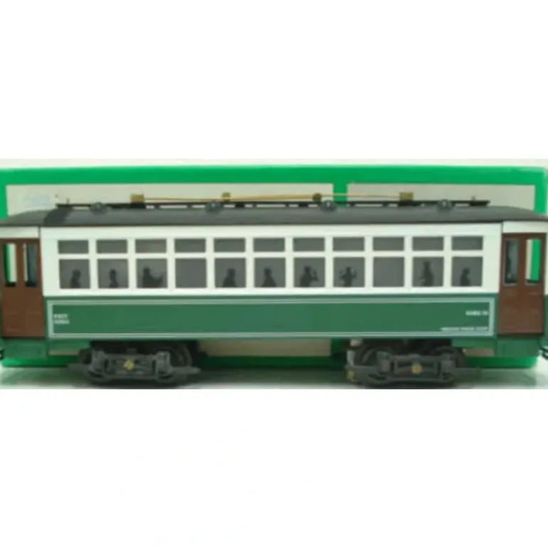 This is a Bowser 551-050127 O Scale Brill AC Powered Trolley Car. Features include a die-cast metal frame, a tinplate body, die-cast metal trucks, interior illumination, passenger silhouetted windows and metal wheels. It measures 10 inches long.