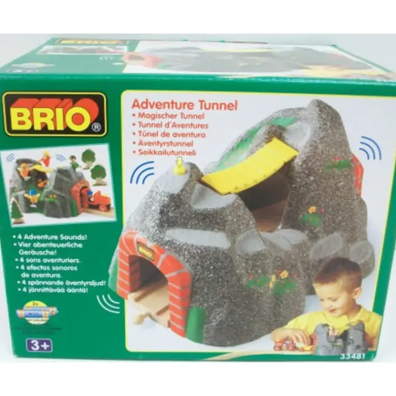 This is a Brio 33481 Wooden & Plastic Adventure Tunnel Set. A tunnel with hidden hillside track and magnetically operated sound system. When the train travels through, sounds are automatically activated for 10 seconds. The sound can be activated by pressing the button. 2 AA b