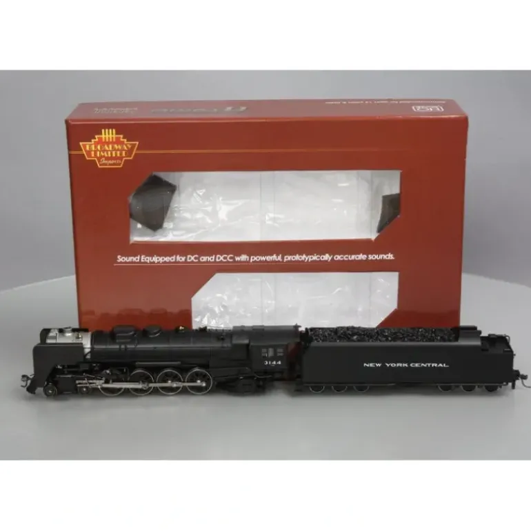 This is a Broadway Limited 1288 HO Scale New York Central Steam L-4b Mohawk 4-8-2 with Tender, Powered with Sound/DC/DCC (Brass Hybrid) #3144, with Boxpok Drivers, Screen Pump Shield. Because their route was flat, New York Central cAlled their 4-8-2s Mohawks after the Mohawk River instead of the more familiar Mountains. NYC had four different classes of Mohawks, L-1 through L-4 used for both freight and passenger service. The fifty L-4s produced by Lima Locomotive Works in 1943 had huge tender coal space supported by two 6-wheel trucks. Smoke deflectors were added to many units in later years. This brass-hybrid model is DC/DCC Sound equipped and Features a five-pole can motor with skew wound armature and flywheel, full cab detail, nickel silver rods and valve gear, prototypical light operation with golden-white Led headlight and scale operating Kadee(R) couplers.
