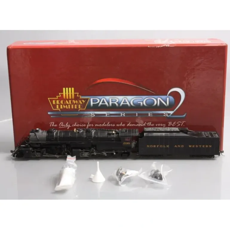 This is a Broadway Limited 2103 HO Scale Norfolk & Western Y6b 2-8-8-2 221 Tender with Sound & DCC – Paragon2 #2199. Features include die-cast construction, metal trucks, knuckle couplers, metal wheels & axles and a motor.