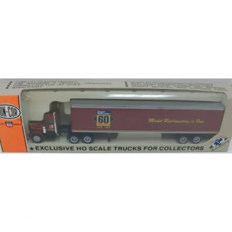 This is a Con-Cor 0004-001078 HO 60 Anniversary Peterbilt W/48′ Maroon Tractor Trailer.