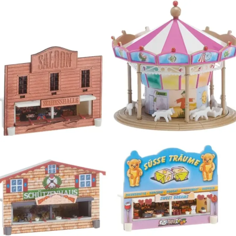 This is a Faller 231722 N Scale Fairground Set Building Kit. This building kit contains: 198 single parts in 10 colours, window foil, 3 decorations and 3 construction instructions. Use for handicrafts FALLER – plastic- and Lasercut glue. Dimensions: 69 x 65 mm, 53 x 25 x 42,5 mm, 59 x 25 x 38,5 mm, 55,5 x 25 x 45 mm.