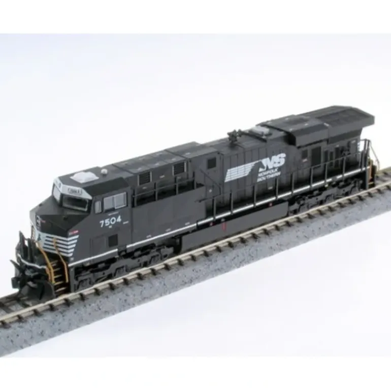 N Scale ES44DC w/3-Window Cab – Norfolk Southern #7504. These detailed models of GE’s popular Evolution series diesels (often called GEVOs by modelers and fans) feature roadname-appropriate detailing including headlight position and truck sideframes, a dual flywheel-equipped mechanism for smooth operation, six-pin DCC decoder socket for easy conversion (decoder sold separately), applied etched-metal and plastic details, knuckle couplers and authentic decoration.