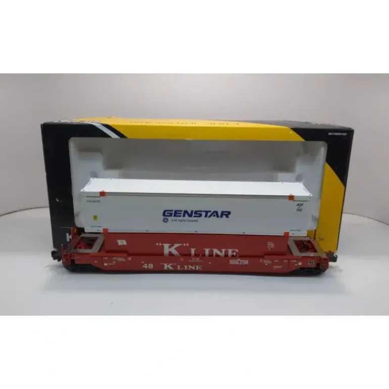 Here is a K-Line K7768 Gunderson Deep Well Flatcar with Trailers. It features sprung die-cast trucks and operating metal couplers, a die-cast body, and prototypical platform & brake details.