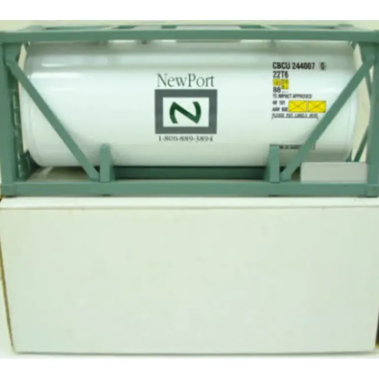Here is a K-Line K7810018 Newport ISO Tank and Frame. This features a metal frame with a Newport tank inside it, a step ladder on one side and is highly detailed. These can be used as loads on any of your loaders for a nice look. This measures approximately 5 inches long and 2 inches high.