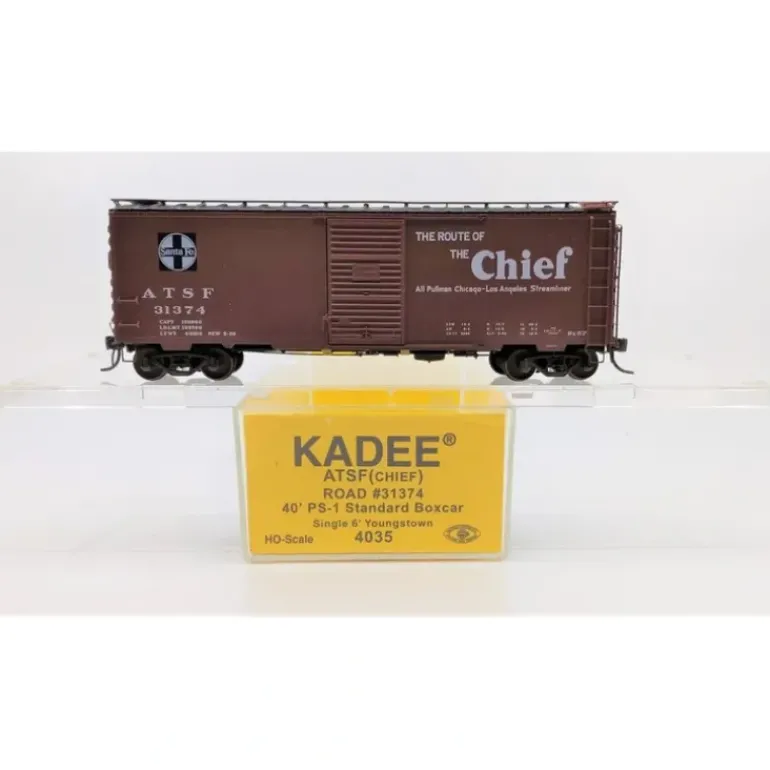 This is a Kadee 4035 HO Scale Santa Fe Chief 40′ PS-1 Standard Box Car. Features include smooth rolling Kadee trucks with self-centering action, Magne-Matic couplers, and a finely detailed body.