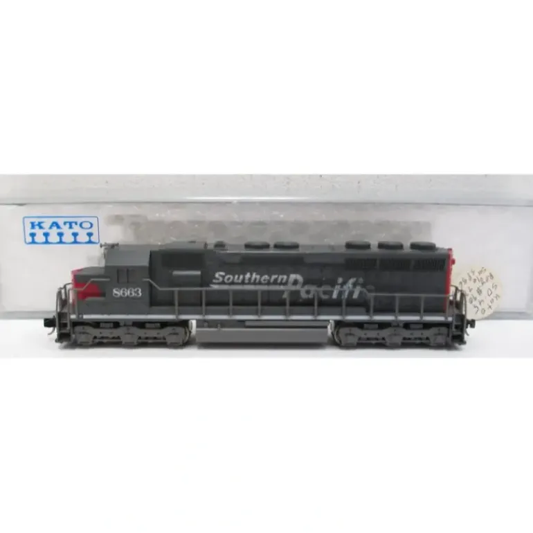 Here is a Kato 176-3116 N Scale Southern Pacific SD45 Diesel Locomotive #8663. This locomotive features a die cast frame, plastic construction, plastic trucks, motor, operating headlamp, knuckle couplers, and metal wheels.