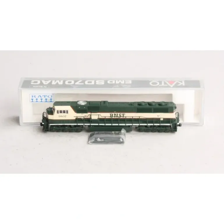 Here is a Kato 176-6302 N Scale BNSF SD70MAC Diesel Locomotive #9837. Features include a powerful motor, plastic construction, plastic trucks, plastic couplers, and metal wheels and axles.