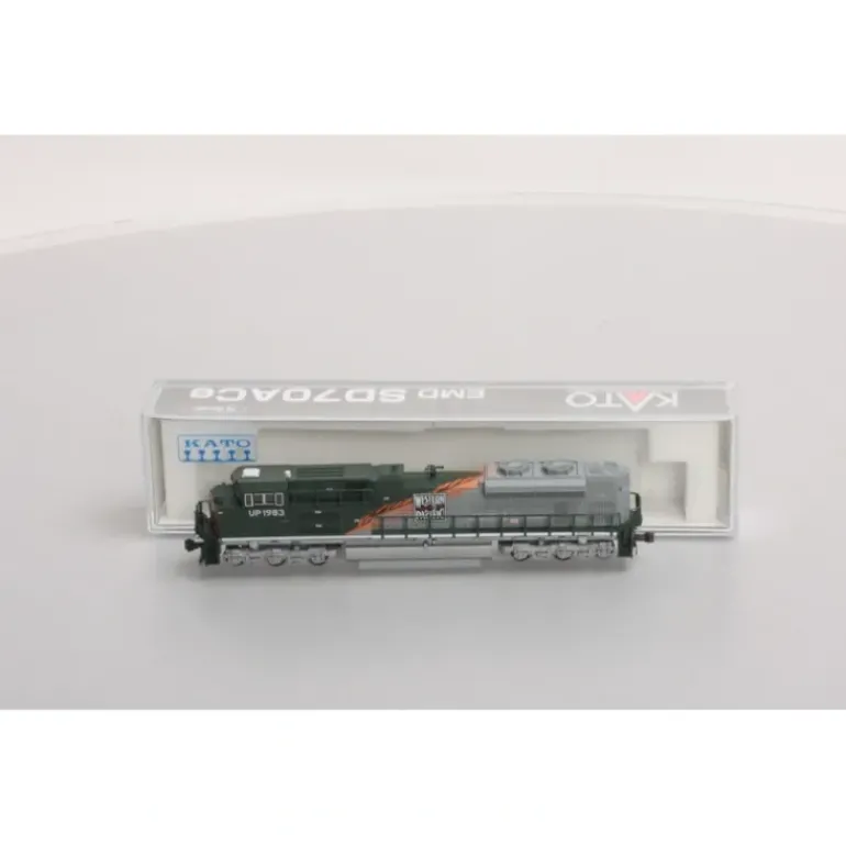 Here we have a Kato 176-8410 N Scale Western Pacific SD70ACe Diesel Locomotive #1983. The SD70ACe is the latest in the line of EMD’s 70 locomotives. The SD70ACe has been designed to fit the latest EPA standards and regulations, and sports 4300 horsepower. The Union Pacific has currently put in the largest purchase order for these units, and as a display of respect for the railroads it has incorporated, has produced six Heritage style painted locomotives with road numbers designated by the year they were merged into the UP. Model Features: Heritage units will be specially painted with their unique paint schemes to honor their respective railroads. Newly designed prototype-accurate bolsterless non-radial HTSC truck and five chime airhorn. Exceptional and crisp molding to accentuate the distinct angular lines of the nose and high dynamic brake. Powerful five-pole KATO motor with dual brass flywheels. Directional Headlight and illuminated, preprinted numberboards. Kato magnetic knuckle coupler. DCC Friendly mechanism ready for drop-in decoder installation.
