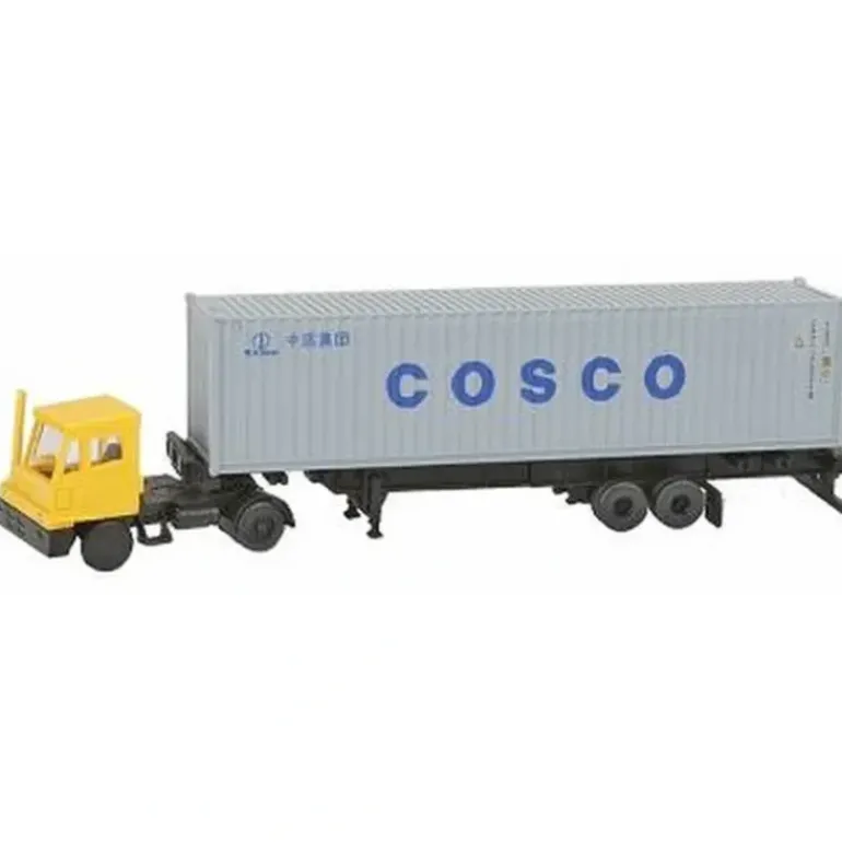 This is an N Scale Yard Tractor Trailer w/ 40′ Container and Chassis. It includes: Yard Truck (Two-tone Red/White), Extendable (40′ to 53′) Container Chassis (Yellow), 40′ CAI Magnetic Intermodal Container.