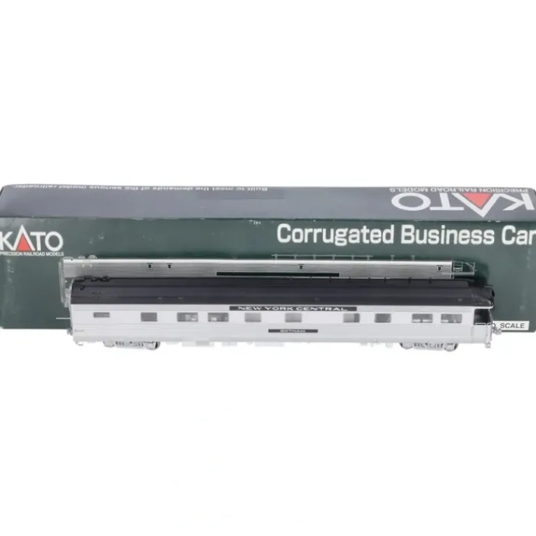 Here is a Kato 35-6004 HO New York Central Gotham Business Car. Also known as Private Cars, Business Cars have existed since the early days of railroading. They are generally self-contained with office, meeting room, track inspection, entertainment, dining and sleeping facilities on board for railway officials and their invited guests. Assigned to key railway personnel for the purpose of inspecting track and traveling on company business, these cars were often handled on the rear of a convenient regularly scheduled passenger run. Today, it is not uncommon to see them at the back of an Amtrak or freight train. They feature free rolling and detailed trucks and the car interior can be lit with an optional 7-502 interior lighting kit with LED.