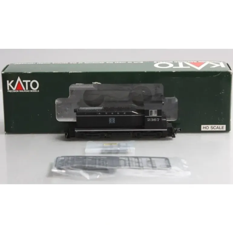 Here is a Kato 37-102 HO Scale ATSF EMD NW2 Diesel Locomotive #2367. This locomotive features a die cast frame, detailed plastic shell, plastic truck sides, precision motor, operating headlamp, horn hook couplers, and metal wheels.