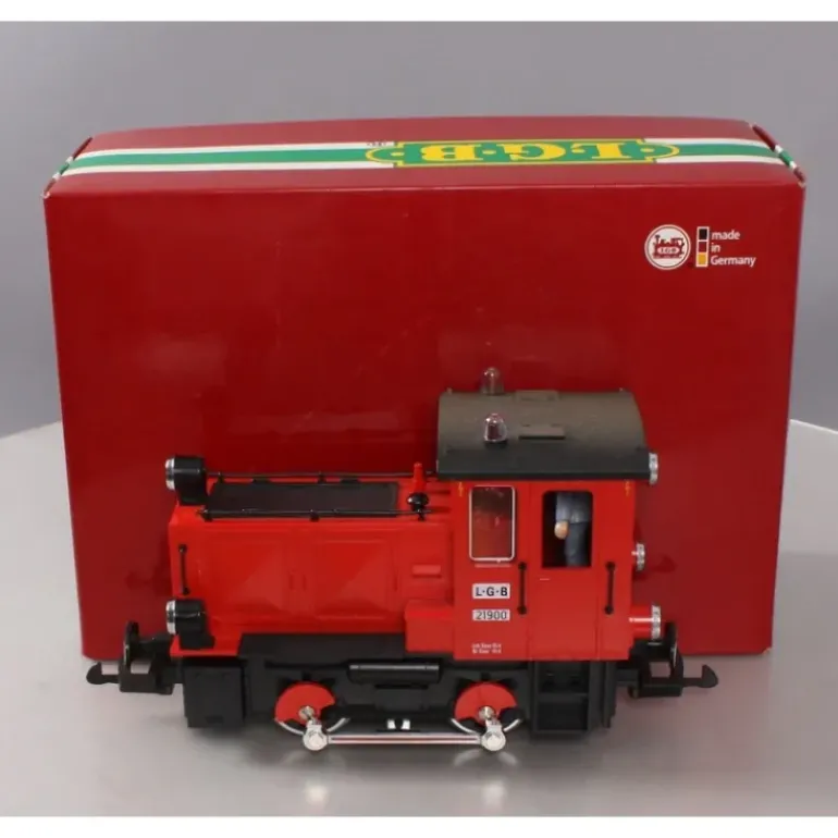 This is a LGB 21900 G Scale DUO-System Diesel Shunting Engine #21900. Features include automatic directional lighting, an electronic voltage stabilization circuit, rear lighting socket, traction tires, cab engineer figure, and weather and dust resistant gear box equipped with a powerful sevenpole Buhler motor.