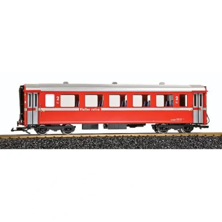 Here is an LGB 30674 RhB Passenger Car. Features include durable plastic construction, opening doors, furnished interior, illumination, plastic diaphragms, separately applied grab rails, latch couplers, plastic truck sides and metal wheels. It measures approximtely 23″ in length.