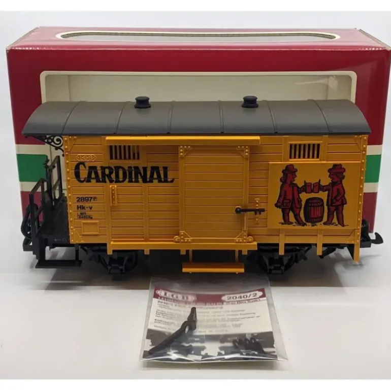 Here is an LGB 4034 G Scale Cardinal Beer Boxcar. Features include plastic latch couplers, plastic trucks, sliding side doors, and plastic wheels.