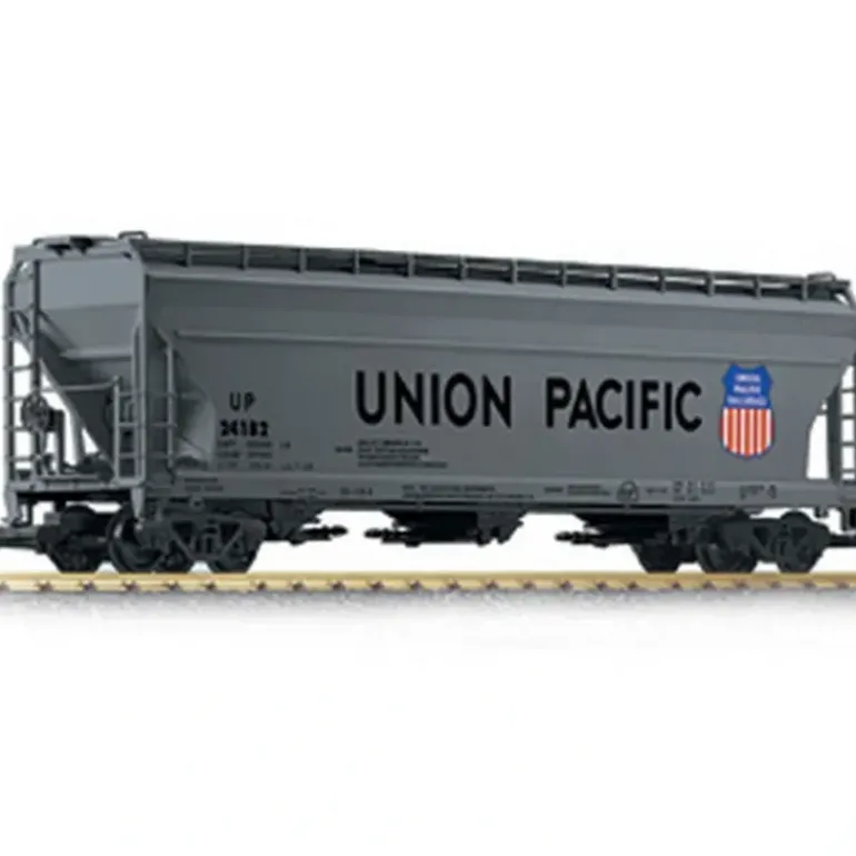 Here is an LGB 41820 Union Pacific Hopper Car. This hopper is scale length and is much longer than most LGB freight cars. This hopper features plastic trucks, knuckle couplers, metal wheels and axles.