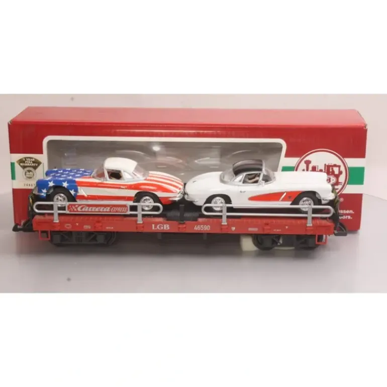 Bring the big worlds of LGB trains and Carrera slot cars together with one exceptional model. It includes two 1:24 scale working Carrera slot cars on one big LGB auto transport car. With these beautifully decorated cars you can run authentic races on your Carrera race track, and this LGB transporter is the ideal way to get them to the track. Authentic, fold-down ramps connect multiple transport cars for easy loading and unloading, and the cars are secured for safe transit.