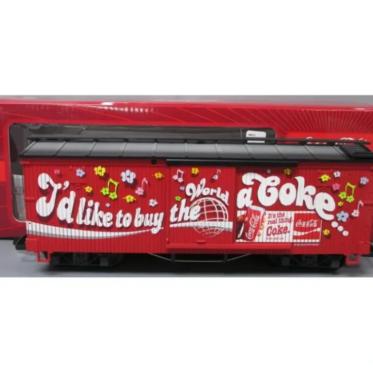 Here is an LGB 46672 G Coca-Cola Melody Boxcar with Sound. This car features electrical wiring, opening doors, plastic trucks, latch couplers, plastic wheels and axles. This unit includes extra trim pieces.