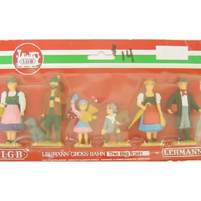 This is a set of 6 LGB 5041 G Scale German Passenger Figures. The figures are brightly colored and made of durable plastic.