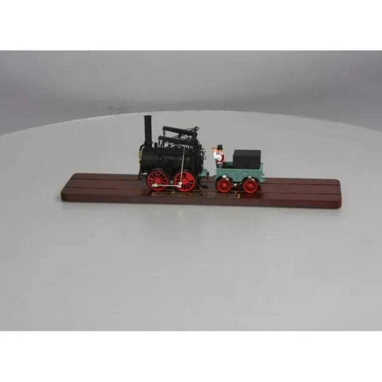 Features include Powered locomotive and tender, Brass and die-cast construction, Switch-controlled forward and reverse operation, Standard O scale model operates on 0-27 curves, Engineer figure, Limited production, Includes display base with track, Gauge: Standard O, the Dimensions: Length: Loco and tender: Approx. 5 Display base with brassplate: Approx. 15 (length of this base can accommodate locomotive, tender, and two coal cars).