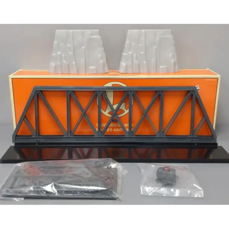 This is a Lionel 6-12772 O Gauge Truss Bridge with Flasher and Piers. This authentically detailed extension bridge is over 2 feet long and features a blinking warning light. It features a stamped metal base and it measures 26 inches x 7 inches x 12 inches.