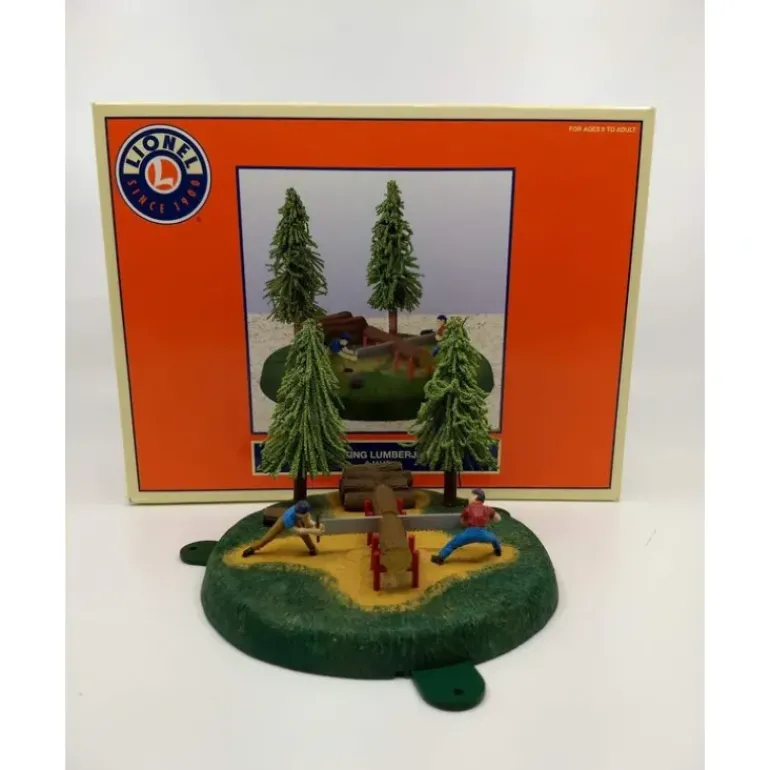 Here is a Lionel 6-14145 O Gauge Operating Lumberjacks. It features two animated lumberjack figures operating a two-man saw. Working by hand, these lumberjacks labor hard, pushing and pulling the saw back and forth through the log. This operating accessory offers the excitement of animation in a compact size that can fit on just about any layout. It is Approx. 4 1/2 inches in diameter x 3 inches high.