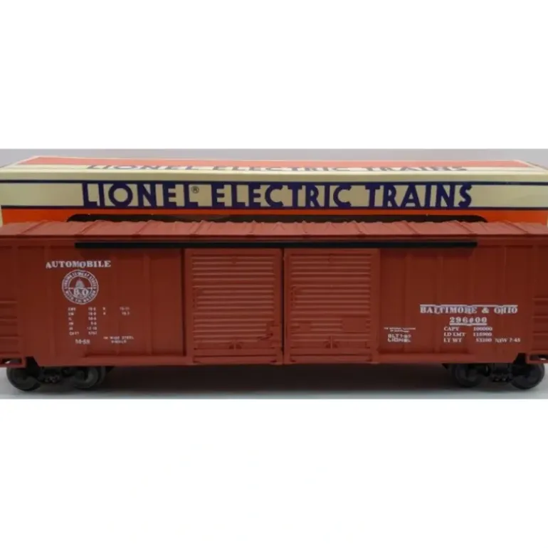 Here is a Lionel 6-17209 O Gauge Baltimore & Ohio Double Door Boxcar #296000. This car is scale length and features die-cast sprung trucks, metal wheels and axles and operating couplers.