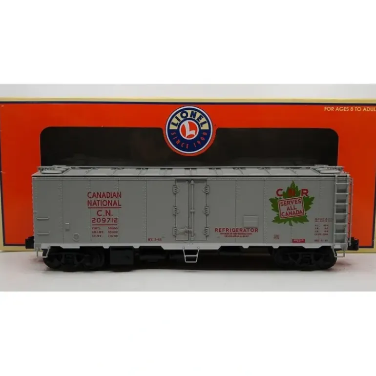 Here is a Lionel 6-17337 O Gauge Canadian National Steel Sided Refrigerator Car #209712. It features die-cast metal sprung trucks and couplers, opening roof hatches, opening doors, and brass and die-cast metal detail parts.