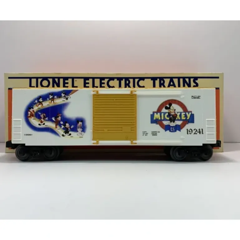 Here is a Lionel 6-19241 O Gauge Disney Mickey Mouse Hi Cube Boxcar. This car features die-cast metal sprung trucks, die-cast metal operating knuckle couplers, and metal wheels and axles.