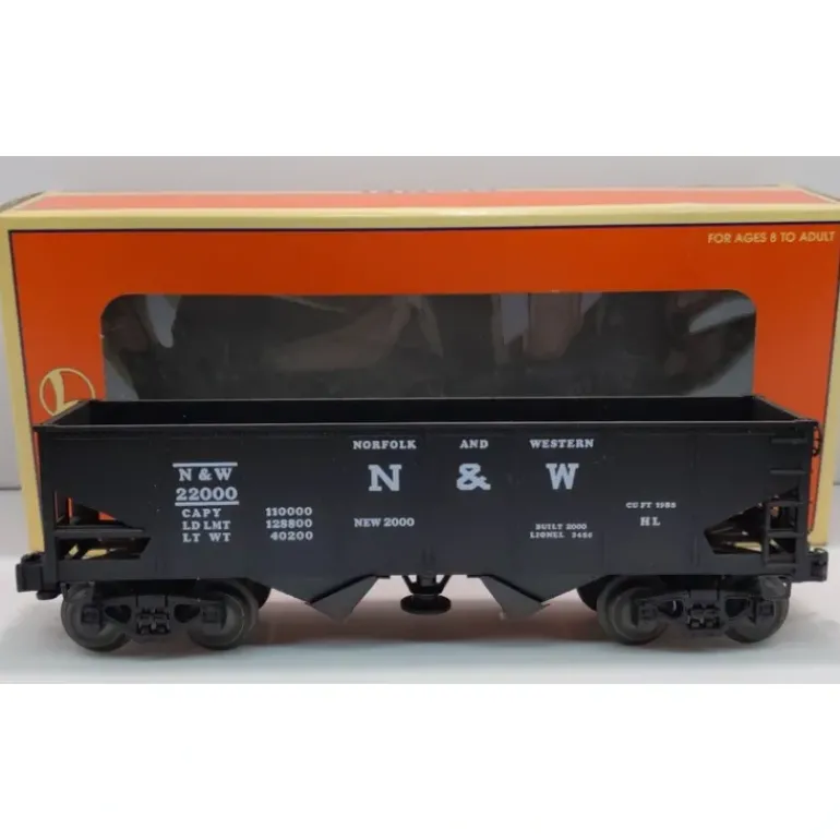 Here is a Lionel 6-19885 O Gauge Norfolk & Western Operating 2-Bay Hopper #22000 from 2000. This car is a reissue of the classic 3456 from 1950-55. This car is designed for use with the 456 Coal Ramp. When activated, coal falls through the chutes on the bottom of the car. This hopper features operating bay doors, a metal brake wheel, die-cast metal sprung trucks, die-cast metal operating knuckle couplers, metal wheels and axles. There is no load included.
