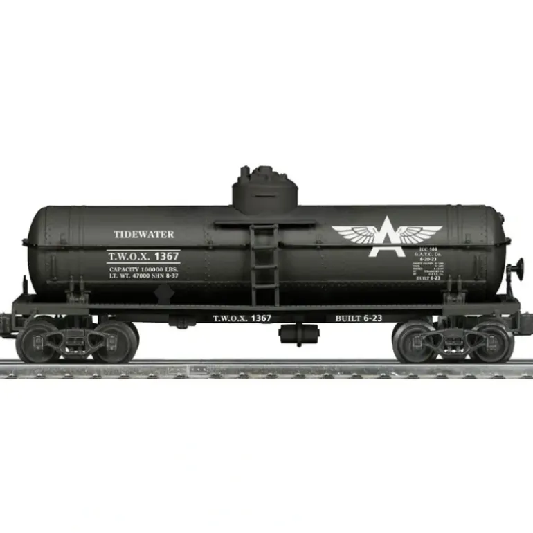 This is a Lionel 6-21634 O Tidewater Flying a Single Dome Tank Car. Traditional Size. Untraditional detail.