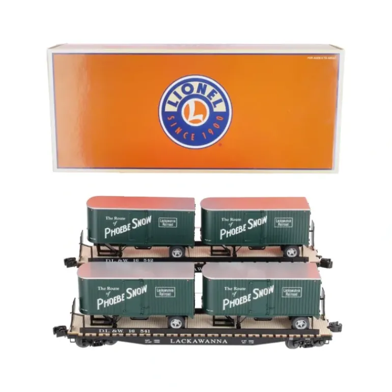 Here is a Lionel 6-21899 Lackawanna PS-4 Flatcars with Piggyback Trailers. Includes two Lackawanna PS-4 Flatcars with Trailers. Each car features two removable trailers, die-cast metal sprung trucks, die-cast metal operating knuckle couplers and metal wheels and axles.