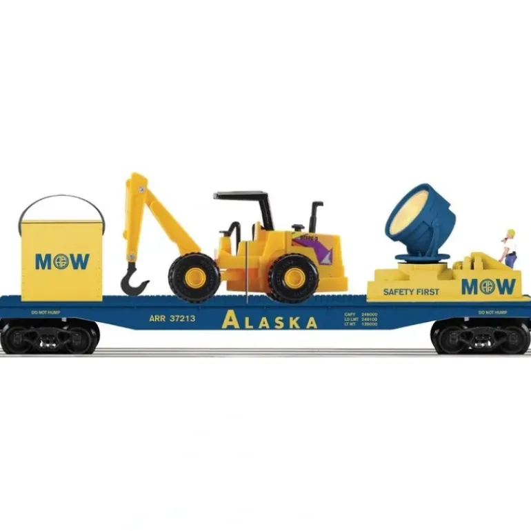 This is a Lionel 6-22151 O Alaska Searchlight Car with Vehicle. This car features die-cast metal sprung trucks, operating knuckle couplers, metal wheels and axles.