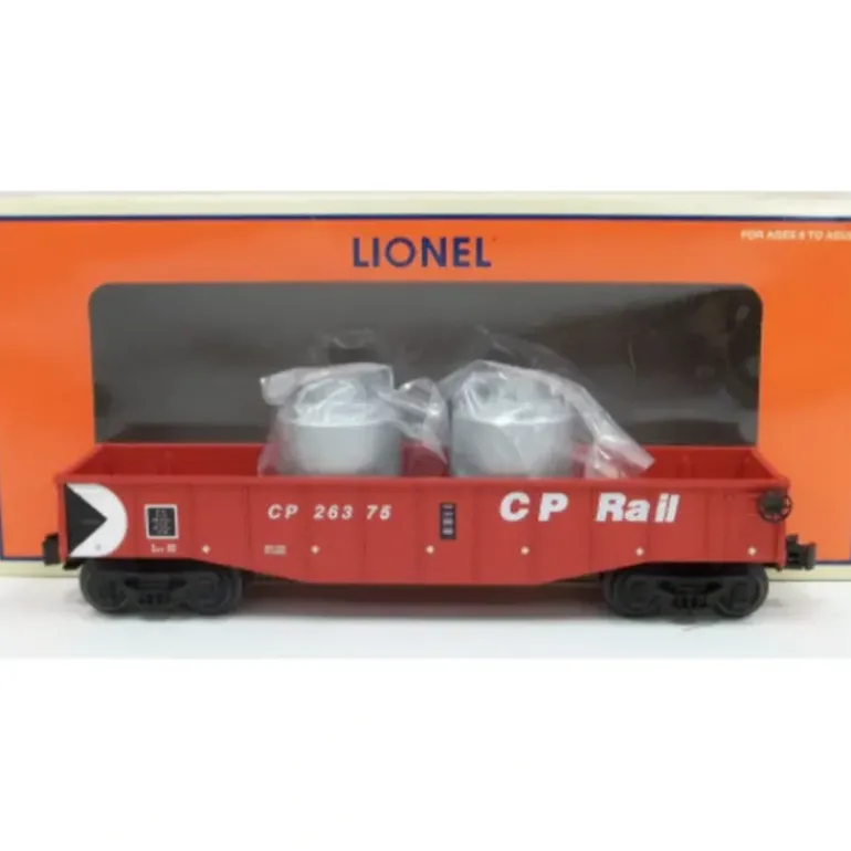 This is a Lionel 6-26375 O Gauge CP Rail Gondola with Canisters . This car features die-cast metal sprung trucks, operating knuckle couplers, metal wheels and axles.