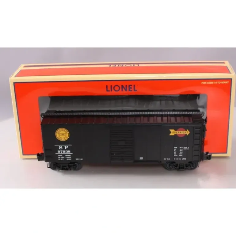 This is a Lionel 6-27275 O Gauge Southern Pacific PS-1 Overnight Boxcar #97938. It features a plastic construction, sliding doors, die-cast metal sprung trucks and operating couplers, hidden uncoupling tabs, metal underframe detail, opening doors, and box loads in the interior.